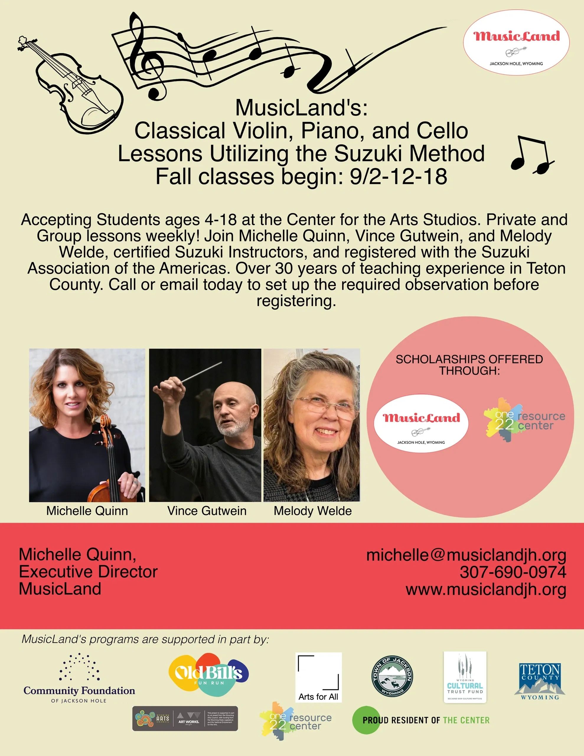 MusicLand is proud to be one of Jackson Hole’s newest 501c3 non-profit’s. Founded in 2019, MusicLand is a resident of the Jackson Hole Center for the Arts. At MusicLand, we believe that music should be accessible to everyone. We strive to create a welcoming and inclusive community where students can learn and grow in a supportive environment.